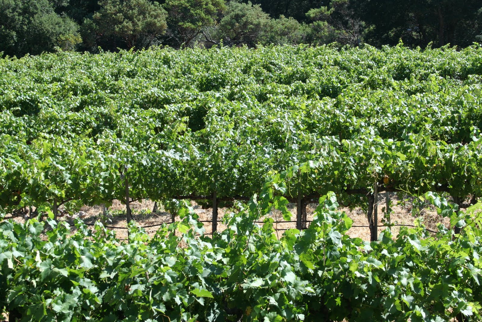 Vines standing tall in their summer green at The Terraces Winery in Napa.